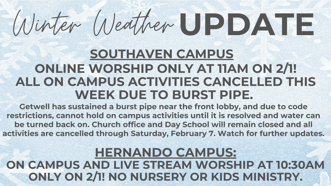 Please plan to join us at 10:30AM ONLY on campus or online this Sunday, February 1 (no nursery or Kids Ministry). Find us online at getwellhernando.online.church or on YouTube.